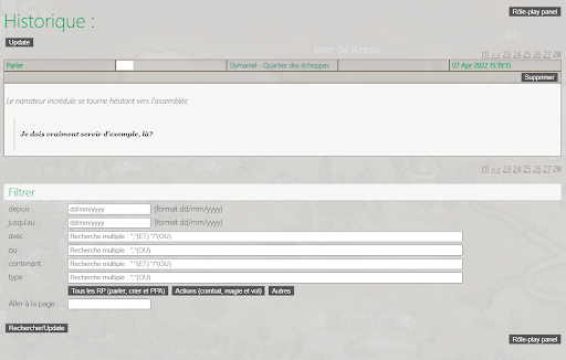 L’historique concerne les interactions avec les autres joueurs, et s’il n’existe aucune forme obligatoire à suivre pour vos textes, en voici une forme courante qui fera une bonne base pour les débutants: