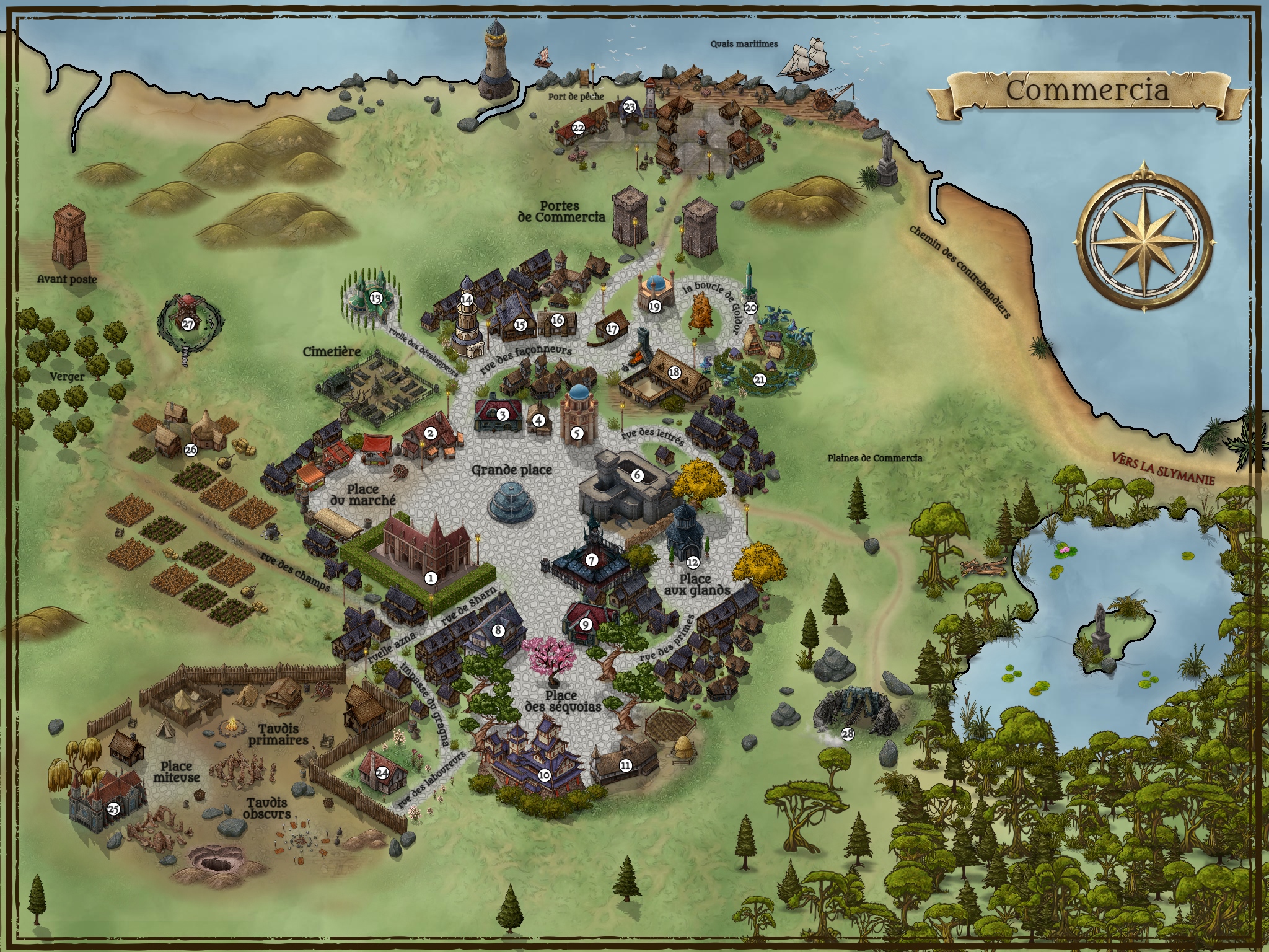 Le monde se détache en quelques villes dispersées dans un environnement riche et varié dont la carte offre un aperçu global: